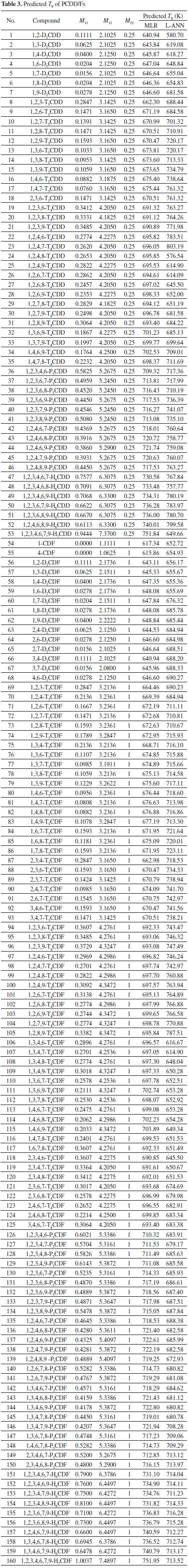 CONCLUSIONS The QSPR model for predicting the boiling point of PCDD/Fs was investigated. The MDEV index was used as structural descriptor of PCDD/Fs. Both MLR model and L-ANN model were developed and investigated. The predictive ability of the developed models was assessed by leave-one-out cross validation and external validation. The validation result indicates that both MLR model and L-ANN model are practicable for predicting the Tb of PCDD/Fs. It is demonstrated that MDEV index of PCDD/Fs is quantitatively related to the Tb of PCDD/Fs. MDEV index can be calculated easily. It is easy and convenient to develop the QSPR model for the Tb of PCDD/Fs based on the MDEV index. In addition, the validation result demonstrates that both MLR and L-ANN are practicable for modeling the quantitative relationship between the MDEV index and Tb of PCDD/Fs. It is reasonable to predict the Tb of PCDD/Fs by using the established models. Thus, the Tb of each PCDD/F congener was predicted by using the developed models. The predicted Tb can be used as an estimation of the boiling point of PCDD/Fs.