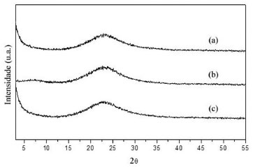 ![]() Figura 1. Difratogramas de raios X dos xerogéis na presença da enzima lipase CAL B: (a) xerogel ácido, (b) xerogel básico e (c) xerogel nucleofílico