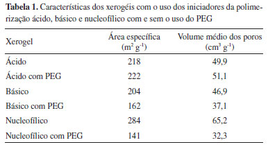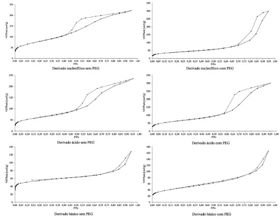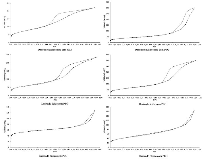Observa-se para os xerogéis ácidos (com e sem PEG) uma similaridade nos valores de área específica e volume médio dos poros. Para os demais xerogéis (básico e nucleofílico) observa-se uma redução, tanto da área específica (entre 20 e 50%) quanto do volume médio dos poros, para os xerogéis sintetizados com PEG, em relação aos sem PEG. Tendências similares são descritas na literatura.7,30,43-45 Os resultados das análises texturais de adsorção/dessorção de N2 realizadas para os xerogéis, obtidos com e sem o uso do PEG, estão apresentados na Figura 2.