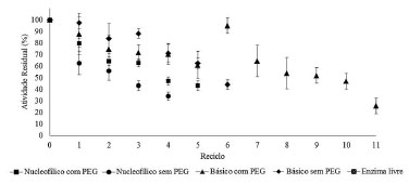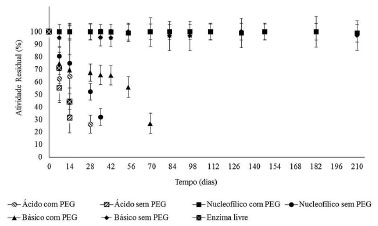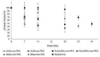 Considerando uma atividade residual > a 50% da atividade inicial, os xerogéis (independentemente do iniciador de reação empregado) sintetizados na presença do PEG foram os que apresentaram os melhores resultados. Destes, destaca-se o xerogel básico, com nove reusos. Resultados similares são observados na literatura para imobilizado em suportes obtidos via sol-gel.7,43,54-59 O processo de imobilização em xerogel proporcionou o aumento da estabilidade térmica, de armazenagem e operacional em reação à enzima livre, como observado nas Figuras 3, 4, 5 e 6. Dentre os xerogéis imobilizados, os que apresentaram melhores resultados foram os com o iniciador de polimerização básico com e sem o uso do PEG e nucleofílico com PEG. Os resultados demostram que os aditivos, tais como polietilenoglicol (PEG), aumentam a eficiência deste tipo de imobilização da lipase.9