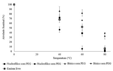 ![]() Figura 5. Atividade de esterificação residual em diferentes temperaturas de contato durante 60 min
