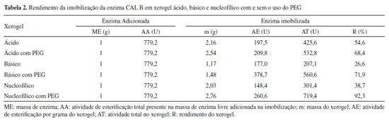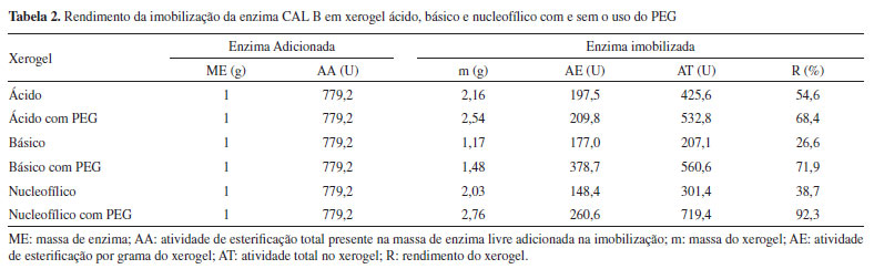 Observa-se na Figura 2 que os xerogéis ácido e nucleofílico, independentemente da presença ou não do PEG, apresentaram isotermas do tipo IV, que são tipicamente exibidas por sólidos mesoporosos,46 com histerese do tipo H2, a qual corresponde a uma distribuição de tamanhos e formas de poros definida, com poros em forma de "tinteiro", com gargalo estreito e corpo largo.47-49 Os xerogéis básicos apresentaram isotermas do tipo II, características de adsorventes não porosos ou macro porosos,46 com histerese do tipo H1, característicos de materiais porosos constituídos por aglomerados rígidos de partículas esféricas de tamanho uniforme ordenados regularmente.47-50 Determinação da atividade de esterificação e do rendimento da imobilização A Tabela 2 apresenta a massa de enzima, a atividade de esterificação teórica adicionada na imobilização, a massa do xerogel obtido, a atividade do xerogel por grama, a atividade de esterificação total do xerogel e os rendimentos de imobilização nos xerogéis obtidos empregando os diferentes iniciadores da reação de polimerização (ácido, básico e nucleofílico), com e sem o uso do PEG 1500.