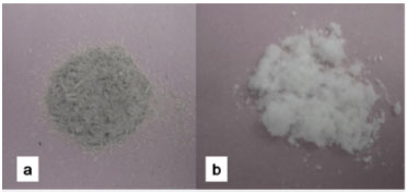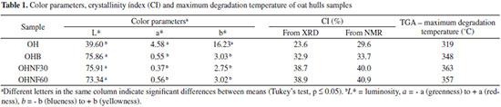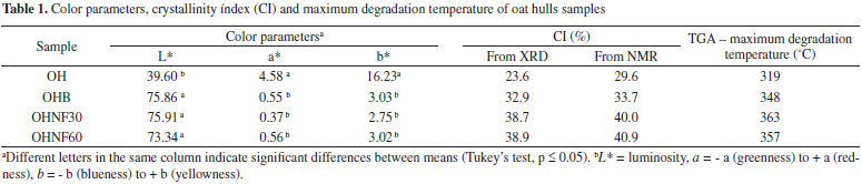 RESULTS AND DISCUSSION The original lignin content of OH (14.5%) decreased in all samples, the lignin contents of OHB, OHNF30 and OHNF75 were 3.50 ± 0.80, 1.12 ± 0.50 and 1.10 ± 0.32%, respectively, showing that the bleaching and acid hydrolysis were effective for cellulose purification. The yield of acid hydrolysis was 32 ± 5% (by dry mass); each 100 g of raw oat hulls resulted in 32 g of nanofibrillated cellulose. Figure 1 shows the aspect of the oat hulls (OH) both before and after bleaching with peracetic acid. After bleaching, the fiber was discolored and turned into a white color, indicating that most of the initial non-cellulosic components were removed by this purification process and that bleached oat hulls have higher cellulose content than raw oat hulls. This result agreed with the color parameter results (Table 1). The luminosity (L* parameter) was indicative of the whiteness of these samples, and in the bleached oat hull (OHB), this parameter significantly (p < 0.05) increased compared to the raw oat hulls (OH), confirming the tendency of bleached samples to have a white color.