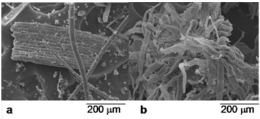 ![]() Figure 2. Micrographs obtained using SEM: raw oat hulls (a) and bleached oat hulls (b)