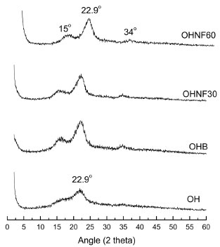 ![]() Figure 4. X-ray diffractograms of OH, OHB, OHNF30 and OHNF60