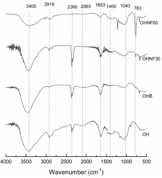 ![]() Figure 5. FT-IR spectra of OH, OHB, OHNF30 and OHNF60