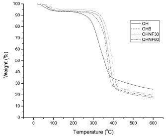 ![]() Figure 6. TGA curves of OH, OHB, OHNF30 and OHNF60