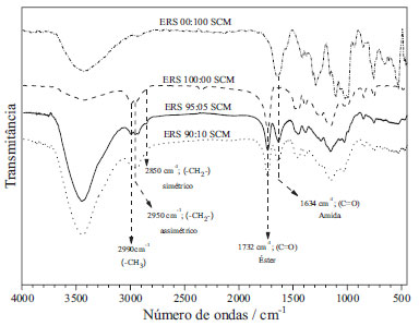 ![]() Figura 1. Espectros de transmitância no infravermelho do SCM (ERS 00:100 SCM), do filme de Eudragit® RS 30D (ERS 100:00 SCM), filme contendo 95% Eudragit® RS 30D e 5% de SCM (ERS 95:05 SCM) e filme contendo 90% Eudragit® RS 30D e 10% de SCM (ERS 90:10 SCM)