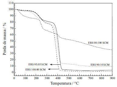 Análises termogravimétricas (TG e DTG) Análise termogravimétrica é um método preciso que tem sido utilizado para estudar a decomposição de materiais poliméricos. As curvas de TG e DTG do SC e SCM são apresentadas nas Figuras 6S e 7S do material suplementar, respectivamente. A amostra de SC apresenta perda de massa em toda faixa de temperatura analisada, sendo possível identificar 3 estágios de perda de massa significativa. O primeiro estágio ocorre entre 25 e 220 ºC. Pela curva de DTG verifica-se que a temperatura de velocidade máxima de perda de massa (Tmax) ocorre a 55 ºC e a perda de massa neste estágio totaliza 16%. Parte desta massa perdida é atribuída à água ligada à estrutura do SC por ligação de hidrogênio. O segundo estágio foi categorizado entre 202 e 722 ºC. Pela curva de DTG verifica-se uma temperatura de velocidade máxima de perda de massa a 240 ºC, sendo a perda de massa neste estágio de 49%. Segundo Zohuriaan e Shokrolahi,42 muitos polissacarídeos (p. ex., quitosana, alginato de sódio, gomas) iniciam seu estágio de decomposição em temperaturas a 200 ºC e, considerando a curva de DTG, pode-se inferir que no segundo estágio houve a decomposição do SC, sendo mais acentuada a 240 ºC. Por fim, tem-se o terceiro estágio categorizado entre 722 e 900 ºC, cuja temperatura de velocidade máxima de perda de massa ocorre em 754 ºC e a perda neste estágio totalizou 17%. A modificação química do SC com TMFT promove formação de retículos intermoleculares e intramoleculares que mudam o comportamento térmico do material,43 o que é facilmente visualizado pelas curvas de TG e DTG. Uma segunda temperatura de decomposição em 410 ºC e uma menor perda de massa em função da temperatura caracteriza maior resistência térmica para as moléculas de SCM. As curvas de TG e DTG do SCM, do filme de Eudragit® RS 30D (ERS 100:00 SCM) e dos filmes compostos de SCM e Eudragit® RS 30D (ERS 90:10 SCM, ERS 95:05 SCM) são apresentadas nas Figuras 2 e 3, respectivamente. Fica evidente que o aumento do SCM na composição eleva a resistência térmica do filme. Foi possível observar que o filme ERS 90:10 SCM possui uma perda de massa menos significativa quando comparado com ERS 95:05 SCM e ERS 100:00 SCM. Além disso, evidencia-se que os filmes contendo SCM mantiveram as características do polímero Eudragit® RS 30D, com principal etapa de degradação térmica entre 327 e 440 ºC com perda de massa de 60%, com máximo na curva DTG em 385, 400 e 409 ºC.