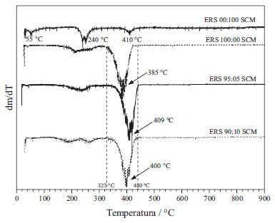 ![]() Figura 3. Curvas DTG do SCM (ERS 00:100 SCM), do filme de Eudragit® RS 30D (ERS 100:00 SCM) e dos filmes compostos de SCM e Eudragit® RS 30D (ERS 90:10 SCM, ERS 95:05 SCM)