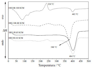 Análise diferencial de varredura (DSC) Análises de DSC das amostras de SC e SCM foram realizadas com objetivo de estudar as transições térmicas em atmosfera de nitrogênio (50 mL min-1) e razão de aquecimento de 10 ºC min-1 (Figura 8S - MS). Ambos os DSC apresentaram um pico endotérmico no intervalo de temperatura de 65 a 110 ºC. Estas transições estão associadas com perda de água (geralmente de 2 a 10% em peso) ligadas a grupos de natureza hidrofílica (p. ex., O-H, -COO-, -PO3-) presente nos polímeros. Também, não foi evidenciada temperatura de transição vítrea (Tg) em ambos os polímeros. Provavelmente, isto se deve à umidade que causa um intenso pico endotérmico entre 65 e 110 ºC. O principal pico dos termogramas de DSC das amostras de SC e SCM ocorrem em 238 ºC e caracteriza uma transição exotérmica. Nesta transição, geralmente estão envolvidas reações de despolimerização e decomposição pirolítica. Ainda no DSC do SCM observam-se transições endotérmicas nas temperaturas de 122, 146 e 402 ºC que estão provavelmente relacionadas com os retículos intermoleculares e intramoleculares gerados devido às modificações químicas do SC com TMFT. Cavalcanti et al.44 também encontraram valores semelhantes para o SC modificado com TMFT. Os picos endotérmicos referentes a decomposição térmica (Figura 4) foram observados em 380 ºC para os filmes de Eudragit® RS 30D (ERS 100:00 SCM), 402 ºC para o SCM (ERS 00:100 SCM) e em 404 ºC para as duas associações (ERS 95:05 SCM e ERS 90:10 SCM). Em síntese, as análises de DSC dos filmes caracterizam juntamente com resultados de TG e DTG que a estabilidade térmica dos filmes de Eudragit® RS 30D aumenta quando estão associados ao sulfato de condroitina modificado (SCM).