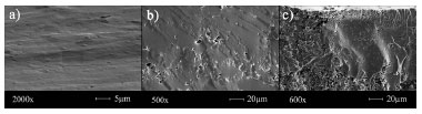 ![]() Figura 5. Micrografias dos filmes isolados após intumescimento em FSI (pH 7,5) obtidas por MEV após intumescimento em fluido de simulação intestinal: (a) controle Eudragit® RS 30 D, Eudragit® RS 30 D associado ao sulfato de condroitina modificado nas concentrações (b) ERS 95:05 SCM e (c) ERS 90:10 SCM