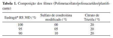 PARTE EXPERIMENTAL Material Sulfato de condroitina (mucopolissacarídeo Solabia, Maringá/PR - Brasil), Eudragit® RS 30 D (copolímero acrilato-metacrilato com grupos amônio quaternário USP/NF/Evonik, Darmstadt - Alemanha); fluidos de simulação gastrintestinal modificado (FSG: fluido de simulação gástrica; FSI: fluido de simulação intestinal), de acordo com a Farmacopeia americana (USP 35ª Ed),37 trimetafosfato trissódico (TMFT - Sigma-Aldrich). Modificação do sulfato de condroitina com trimetafosfato trissódico (TMFT) O método de preparo está detalhado em trabalho anterior.36 Resumidamente: o sulfato de condroitina foi preparado a 1% em água mantendo-se em pH 12 sob agitação por um período de 2 h. Em um volume de 200 mL da dispersão de SC foram adicionados 20 mL de uma solução 30% de TMFT, o que equivale a 1 equivalente de TMFT, mantendo-se a agitação por mais 2 h, com o pH mantido em 12.36,38 Produção de filmes de sulfato de condroitina modificada Os filmes foram preparados pela metodologia de solubilização e evaporação de solvente (casting process), como descrito previamente.36 Os filmes poliméricos foram preparados utilizando-se dispersões aquosas poliméricas, Eudragit® RS 30 D, plastificado com citrato de trietila (CTE). A temperatura mínima para formação dos filmes estabelecida foi de 50 ºC.39 O polímero sintético, Eudragit® RS 30 D, foi associado ao polissacarídeo sulfato de condroitina modificado com trimetafosfato trissódico, sendo a massa polimérica final em solução igual a 4% p v-1 para cada filme, conforme Tabela 1.