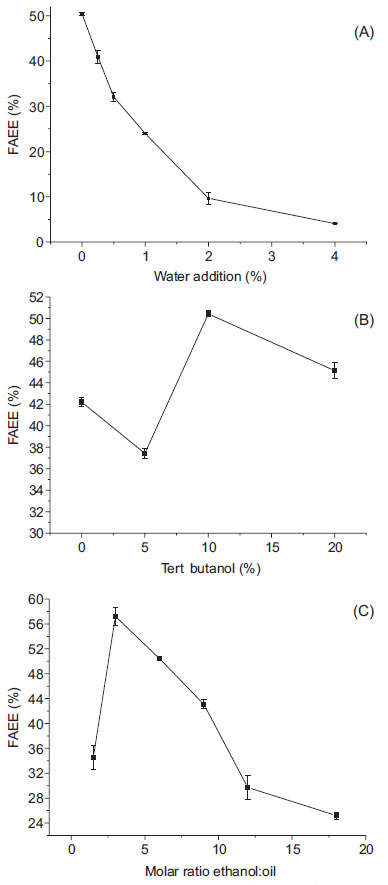 ![]() Figure 2. Effect of water addition (A), tert-butanol (B) and molar ratio (C) on the transesterification of soybean oil catalyzed by Novozyme 435 under CH. Conditions: 60 ºC, 3.36% enzyme loading