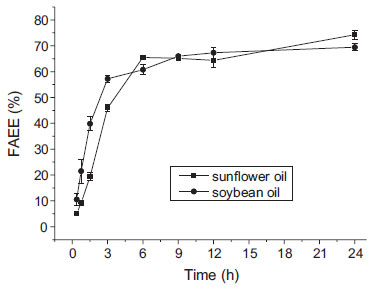 ![]() Figure 3. Transesterification progress. Conditions: 60 ºC, 1:3 oil-to-ethanol molar ratio, 3.36% enzyme loading, tert-butanol 10%, addition water 0%