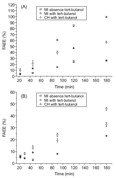 ![]() Figure 4. Transesterification of soybean (A) and sunflower (B) oils catalyzed by Novozyme 435 under MW by fixed power (FP) mode (with and without tert-butanol) and CH (with tert-butanol). Conditions: 60 ºC, 3.36% enzyme loading