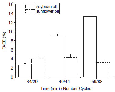 ![]() Figure 5. FAEE production by enzymatic transesterification of vegetable oils under MW by power cycling mode (PC) with tert-butanol. Conditions: 60 ºC, 3.36% enzyme loading