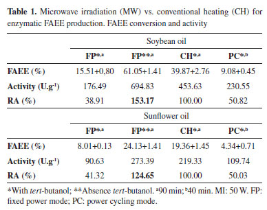CONCLUSION Novozyme 435 was successfully activated for transesterification of vegetable oils via microwave. It was observed a significant effect of the association of tert-butanol and microwave irradiation on the enzymatic catalytic activity. The results showed that the use of microwave operating at fixed power mode improves the enzymatic activity (RA = 153%, with soybean oil). Soybean oil was 100% converted to FAEE in just 3 h of reaction using microwave heating (fixed power mode), while under conventional heating the conversion was about 57% at similar reaction conditions. Microwave presents itself as an important ally to the conventional enzymatic catalysis in order to make practical application of lipases in industrial scale for biodiesel production.