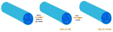 As preparation of SBA-Pr-SO3H is illustrated in Figure 1, the calcined SBA-15 silica was functionalized with (3-mercaptopropyl) trimethoxysilane (MPTS) and then, the thiol groups were oxidized to sulfonic acid by hydrogen peroxide. Different methods such as TGA, BET and CHN methods were employed to analyze the surface of the catalyst which was demonstrated that the organic groups (propyl sulfonic acid) were immobilized into the pores.29