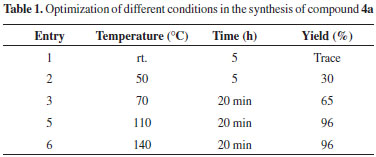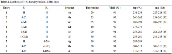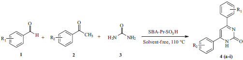 RESULTS AND DISCUSSION In continuation of our interest in the developing of green methodologies and the synthesis of diverse heterocyclic compounds of pharmaceutical importance, we report herein the synthesis of some 4,6-diarylpyrimidin-2(1H)-ones 4a-4i derivatives under neat condition. Thus, a three-component reaction of aromatic aldehydes 1, acetophenones 2 and urea 3, in the presence of sulfonic acid functionalized silica (SBA-Pr-SO3H) as catalyst at 110 ºC, has been shown to give 4,6-diarylpyrimidin-2(1H)-ones derivatives 4a-4i in excellent yields (Scheme 2). However, 3,4-dihydropyrimidin-2(1H)-ones has been prepared40 from the reaction of aromatic aldehydes, aromatic ketones, and urea using a Lewis acid (FeCl36H2O-TMSCl) as catalyst; but we did not find 3,4-dihydropyrimidin-2(1H)-ones in our investigation. In addition, the crucial role of catalysis, solvent effects, mechanisms, kinetics and etc. in the Biginelli reactions are discussed in the recently published articles.41-45