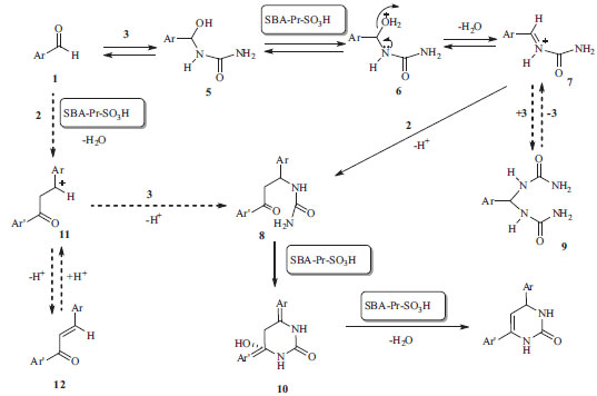 ![]() Scheme 2. Synthesis of 4,6-diarylpyrimidin-2(1H)-ones using SBA-Pr-SO3H as catalyst
