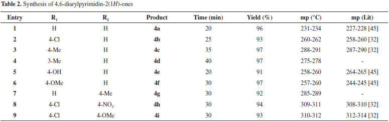 4,6-Diphenyl-pyrimidin-2(1H)-one (4a): IR (KBr, vmax): 3420, 3285, 3084, 3005, 2894, 2856, 2741, 1618, 1577, 1495, 1455, 1397, 1338, 1069, 823, 681 cm-1. 1H NMR (250 MHz, CDCl3): δ 7.50-7.61 (m, 7H, ArH& H-5), 8.13-8.16 (m, 4H, ArH), 12.07 (s, 1H, NH). 13C NMR (100 MHz, DMSO-d6): δ 164.9, 157.0, 133.2, 132.3, 128.9, 128.0, 100.8, 56.0.39 EI-MS: 248 (M+), 171, 94, 77. 4-(4-Chlorophenyl)-6-phenyl-pyrimidin-2(1H)-one (4b): IR (KBr, vmax): 3423, 3385, 3104, 3058, 3002, 2892, 2743, 1614, 1568, 1490, 1437, 1391, 1333, 1089, 990, 821, 765, 683 cm-1. 1H NMR (250 MHz, CDCl3): δ 7.49 (d, J = 7.5 Hz, 2H, ArH), 7.52-7.62 (m, 4H, ArH & H-5), 8.12 (d, J = 7.5 Hz, 2H, ArH), 8.18 (d, J = 7.5 Hz, 2H, ArH), 12.17 (s, 1H, NH). 13C NMR (100 MHz, DMSO-d6): δ 160.2, 144.9, 135.6, 129.0, 127.7, 109.6.39 EI-MS: 282 (M+), 171, 111, 94, 77. 4-(4-Methylphenyl)-6-phenyl-pyrimidin-2(1H)-one (4c):39 IR (KBr, vmax): 3410, 2794, 1674, 1592, 848, 773 cm-1. 1H NMR (400 MHz, DMSO-d6): δ 8.11-8.20 (m, 4H, ArH), 7.49-7.60 (m, 6H, ArH), 2.36 (s, 3H, CH). 13C NMR (100 MHz, DMSO-d6): δ 142.1, 131.9, 129.9, 129.3, 128.0, 128.0, 21.5;. EI-MS: 262 (M+), 247, 171, 94, 92, 77. 4-(3-Methylphenyl)-6-phenyl-pyrimidin-2(1H)-one (4d): IR (KBr, vmax): 3423, 3293, 3093, 3005, 2897, 1618, 1491, 1339, 1202, 1154, 1070, 991, 808, 774, 692 cm-1. 1H NMR (250 MHz, CDCl3): δ 2.39 (s, 3H, CH3), 7.49 (d, J = 7.5, 2H, ArH), 7.53-7.58 (m, 4H, ArH & H-5), 7.91-8.12 (t, 2H, ArH), 8.14 (d, J = 5.75 Hz, 2H, ArH), 12 (s, 1H, NH). EI-MS: 262 (M+), 247, 171, 94, 77. 4-(4-Hydroxyphenyl)-6-phenyl-pyrimidin-2(1H)-one (4e):39 IR (KBr, vmax): 3331, 3300, 2928, 1659, 1616, 779 cm-1. 1H NMR (400 MHz, DMSO-d6): δ 11.88 (hr, s, lH, NH), 10.21 (s, lH, OH), 8.08 (m, 4H, ArH), 7.56 (d, J= 7.2 Hz, 3H, ArH), 7.42 (s, lH, ArH), 6.91 (d, J = 8.8 Hz, 2H, ArH) 13C NMR (100 MHz, DMSO-d6): δ 161.0, 131.5, 129.7, 128.9, 127.6, 115.7. EI-MS: 264 (M+), 247, 171, 94, 77. 4-(4-Methoxy-phenyl)-6-phenyl-pyrimidin-2(1H)-one (4f): IR (KBr, vmax): 3320, 3096, 1615, 1513, 809, 744 cm-1. 1H NMR (400 MHz, DMSO-d6): δ 8.09 (tri, 2H,ArH), 7.99 (d, J=7.6 Hz, 2H, ArH), 7.59 (d, J= 5.2 Hz, 3H, ArH), 7.39 (d, J= 8.0 Hz, 2H, ArH), 7.14 (m, lH, ArH), 2.48 (s, 3H, CH). 13C NMR (100 MHz, DMSO-d6): δ 162.3, 131.5, 129.5, 128.9, 127.7, 117.4, 55.6. EI-MS: 278 (M+), 247, 171, 108, 94, 77. 4-(Phenyl)-6-(4-Methylphenyl)-pyrimidin-2(1H)-one (4g): IR (KBr, vmax): 3436, 3280, 3096, 3005, 2901, 2745, 1616, 1512, 1459, 1338, 1180, 919, 808, 774, 691 cm-1. 1H NMR (250 MHz, CDCl3): δ 2.38 (s, 3H, CH3), 7.35 (d, J = 7.5 Hz, 2H, ArH), 7.51-7.58 (m, 4H, ArH & H-5), 8.05 (d, J = 7.5 Hz, 2H, ArH), 8.13 (d, J = 7.5 Hz, 2H, ArH), 12 (s, 1H, NH). EI-MS: 262 (M+), 247, 171, 94, 77. 4-(4-Chlorophenyl)-6-(4-nitrophenyl)-pyrimidin-2(1H)-one (4h): IR (KBr, nmax): 3412, 3192, 2921, 1612, 1548, 1515, 1456, 1348 cm-1. 1H NMR (300 MHz, DMSO-d6): δ 6.90-7.83 (m, 9H, ArH & H-5), 9.98 (s, 1H, NH). EI-MS: 327 (M+), 247, 171, 77. 4-(Chlorophenyl)-6-(4-Methoxyphenyl)-pyrimidin-2(1H)-one (4i):31 IR (KBr) 3429, 3 100, 289 0, 1617, 1582, 810, 600 cm-1; 1H NMR (CDCl3, 200 M Hz) d 3.8 (s, 3H, OCH3 ), 7.09 (d, J =8.4 Hz, 2H, Ar), 7.53 (s, 1H, =CH-), 7.61 (d, J = 8.09 Hz, 2H, Ar), 8.17 (m, 4H, Ar), 1 2.0 (br, 1H, NH); 13C NMR (CDCl3, 50 MHz) d 100.4, 115.1, 115.4, 128.8, 129.7, 129 .9, 130.2, 130.4, 130.7, 131.2, 137.1, 160.7, 163.0.