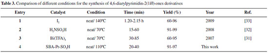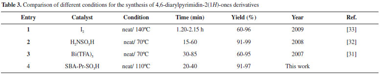 As illustrated in the Table 3, comparison of the effectiveness of various catalysts used in the synthesis of 4,6-diarylpyrimidin-2(1H)-ones derivatives is shown the advantages of current methodology. The simplicity, low reaction time and high yields of products under a green condition are resulted from the efficiency of sulfonic acid functionalized silica (SBA-Pr-SO3H) as a heterogeneous nano catalyst.
