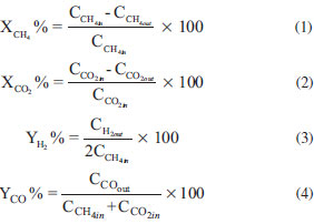 Nanocatalyst characterization techniques The structure of catalysts was assessed using XRD analyzer (D5000 Siemens, Germany). The conditions of analysis were as follows: Cu-Ka radiation; scanning rate: 0.03º s-1; scanning range (2θ): 20-90º. The morphology and particle size of the nanocatalysts were observed by Field Emission Scanning Electron Microscopy (FESEM) analyzer (HITACHI S-4160, Japan). In order to confirm the presence of metals and study of dispersion, Energy dispersive X-ray (EDX) analysis was conducted. The BET surface area of the catalysts was measured by N2 adsorption at liquid-nitrogen temperature, using a surface area analyzer (Quantachrome chembet-3000, America). Investigation on functional groups of the synthesized nanocatalysts was carried out by Fourier Transform Infrared Spectroscopy (FTIR, UNICAM 4600) in the range of 400-4000 cm-1 wave number. Experimental setup for catalytic performance test Utilized experimental setup for activity measurement of the synthesized nanocatalysts consists of a gas feeding section, a fixed bed reactor, and an analytical section. Prior to catalytic activity tests, all catalysts were reduced for 4 h in hydrogen at a flow rate of 30 cm3/min and 700 ºC. The catalytic performance of nanocatalysts was investigated in the atmospheric pressure, stoichiometric feed ratio, GHSV of 24 l/gcat h and temperature range from 550 to 850 ºC. The reaction was performed at U-shaped quartz reactor with 6 mm internal diameter mounted vertically inside a tubular furnace. The quartz micro reactor was charged with 0.1 g of calcined catalyst and surrounded by chips to maintain the bed in the desired location. Heating rate of nanocatalyst was 10 ºC per minutes. Stability tests were performed at 850 ºC for 1440 min. The reaction products were sent to an online gas chromatograph (GC Chrom, Teif Gostar Faraz, Iran). Employed column for separation of gaseous was Carboxen-1000. To ensure reproducibility of the results, the experiments were repeated under similar conditions several times. Blank runs showed no conversion in the range of reaction temperatures. The conversion of reactants and products yield is calculated as follows: ![]() where Ci,in/out is the flow rate of each component in the feed or effluent.