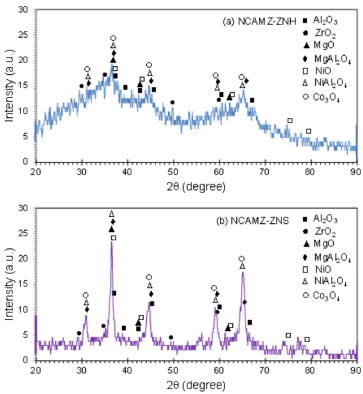 ![]() Figure 2. XRD patterns of Ni-Co/Al2O3-MgO-ZrO2 nanocatalysts: (a) NCAMZ-ZNH and (b) NCAMZ-ZNS