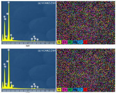 EDX analysis Figure 4 shows the results of EDX analysis for the prepared Ni-Co/Al2O3-MgO-ZrO2 nanocatalysts. EDX spectra confirmed the existence of the all elements used in the synthesis procedure. The outcomes of this analysis supported the declared assertion about the dispersion of the synthesized nanocatalysts in XRD and FESEM analyses. As depicted in the images, all elements specially Ni and Co are uniformly dispersed over the nanocatalysts surface. Briefly, the outcomes of EDX analysis exhibited: (i) acceptable dispersion was obtained for both prepared samples. (ii) NCAMZ-ZNS presented the better dispersion which is going to affect the catalytic process.