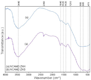 ![]() Figure 5. FTIR spectra of Ni-Co/Al2O3-MgO-ZrO2 nanocatalysts: (a) NCAMZ-ZNH and (b) NCAMZ-ZNS