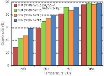 Catalytic performance study toward CO2-reforming of CH4 effect of ZrO2 precursoron feed conversion at different temperatures Feed (CH4 and CO2) conversion of the synthesized nanocatalysts was recorded at constant molar feed ratio, GHSV equal 24 l/gcat and temperature range of 550 to 850 ºC and obtained results are depicted in Figure 6. Diagrams obviously present that ascending temperature enhances the feed conversion for all samples which is related to the endothermic nature of DRM. Moreover, it was found NCAMZ-ZNS represent the better catalytic performance (XCH4=98% and XCO2=97.8% at 850 ºC) compared with the NCAMZ-ZNH. The superior performance of NCAMZ-ZNS is related to its excellent characterization such as smaller particle size, uniform dispersion and higher surface area. Furthermore, feed conversion increase at the higher range of evaluated temperatures is less than lower parts. For example, CH4 conversion for NCAMZ-ZNS at 850 ºC is 98% which is 6.48% better than 750 ºC while the improvement of the conversion for 650ºC and 550 ºC is 26.40%. This trend might derive of variable effect of side reactions at different temperatures and approaching to the equilibrium conversion. Moreover, for both nanocatalysts, CH4/CO2 is less than unit and this ratio increases as reaction temperature rises. This observation might be associated to the occurrence of the side reactions such as RWGS which are affected by reaction temperature and will be discussed in next section.
