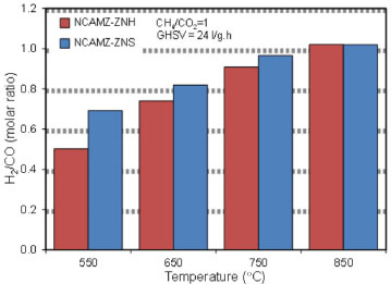 Effect of ZrO2 precursor on H2/CO ratio at different temperatures As mentioned previously, production of H2/CO ratio close to 1 is desirable for synthesis of higher hydrocarbons and oxygenated derivatives. So, this subject is considered as one of the main goals of DRM. Accordingly, H2/CO ratio for synthesized nanocatalysts was investigated and outputs were illustrated in Figure 7. The obtained results proved that NCAMZ-ZNS represented higher syngas production and more close to unit H2/CO ratio in all of the investigated temperature rang. Figure 7 shows that H2/CO for NCAMZ-ZNS at 650 ºC and 750 ºC are 82% and 97%, respectively. In addition, this ratio is approximately unit at 850 ºC. As noted above, better performance of NCAMZ-ZNS is attributed to its superior physiochemical properties such as smaller particle size, uniform dispersion and higher surface area which were attained due to the utilization of the better zirconia precursor. However, H2/CO ratio for NCAMZ-ZNH until 650 ºC is lower than 0.80 and just at 850 ºC is moving toward unity. Furthermore, for both nanocatalysts, H2/CO is less than unit and this ratio approaches toward unity as temperature rises. This behavior is related to the influence of the reaction temperature on the rate of side reactions such as RWGS which occur simultaneously with main reaction of DRM. On one hand, methane cracking reaction accelerates by temperature increasing which leads to the easy decomposition of C-H bonds at higher temperatures. On the other hand, the exothermic RWGS reaction is favored with decreasing temperature. Thus, as the temperature rises, H2 yield and CH4 consumption increase. However, CO yield and CO2 consumption reduce. Therefore, at higher temperatures, the conversion of CH4 and CO2 are approaching to each other and CH4/CO2 is moving toward unity.