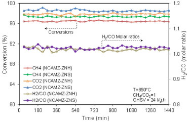 Time on stream performance According to literature, one of the important requirements for the competitive commercial reforming catalysts is high stability and resistance to deactivation by coke.40,68 Therefore, reactants conversion and H2/CO of the NCAMZ-ZNS and NCAMZ-ZNH were tested at 850 ºC, GHSV=24 l/gcat h and equimolar feed ratio during1440 min time on stream. Recoded results are shown in Figure 8. The graphs demonstrated that there was no significant deactivation for none of prepared nanocatalysts. On the hand, it is known that particle size and their distribution and also SMSI are effective parameters in the rate of carbon deposition. On this basis, the rate of deactivation is dependent on the factors that influence these parameters. Therefore, acceptable stability of samples might be related to the utilization of sol-gel method which is an appropriate method for preparation of high homogeneity composition and smaller particle size distribution.30 Moreover, this behavior probably is related to the addition of cobalt. Synergy of Ni-Co leads to the enhanced SMSI, separation of metal ensembles in smaller metal particles and reduction of carbon deposition.48,69 A detailed examination indicates NCAMZ-ZNS illustrated the best performance by representing reactants conversion in the range of 97.2-99% and also H2/CO ratio close to unit at 850 ºC during 1440 min. Moreover, beside the appropriate synthesis method and suitable active phase promoter, the catalytic performance will be enhanced via employment of proper support promoters. In the case of NCAMZ-ZNS, utilization appropriate zirconia precursor altered the characterization. Therefore, in agreement with FESEM, BET and EDX analyses, surface area increased, uniform particle size distribution was obtained and finally high and stable catalytic performance was observed. However, it should be noted that to assess the nanocatalyst durability, long-term stability tests and more investigations are required.