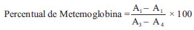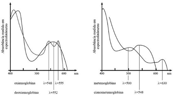 METODOLOGIA A metodologia empregada para análise de metemoglobina foi descrita primeiramente por Evelyn-Malloy (1938),12 posteriormente foi modificada por J. Meunier (1972) e atualizada por Carrazza (1998),13 na qual a dosagem de metemoglobina no sangue venoso é realizada por meio de espectrofotômetro UV-visível. Essa técnica se fundamenta no princípio de que os pigmentos sanguíneos oxiemoglobina, deoxiemoglobina, metemoglobina e cianometemoglobina possuem absorção máxima em comprimentos de ondas semelhantes, mas cada pigmento tem picos de absorção menores, porém significativos, em diferentes comprimentos de onda, conforme representado na Figura 1.