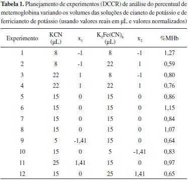 RESULTADOS E DISCUSSÃO O estudo de comparação entre as rotações utilizadas no processamento da amostra foi realizado visando comparar a eficácia nesta análise da centrífuga clínica, de mais fácil acesso e manipulação em diversos laboratórios de análises clínicas, que permite obter 6.000 rotação por minuto, com a centrífuga de grande porte que possibilita alcançar uma rotação de 10.000 rpm. A proposta de mudança na rotação se justifica pelo fato de que a probabilidade de que um laboratório de análises clínicas tenha acesso a uma centrífuga com capacidade de rotação por minuto de 10.000 rpm é pequena e que os altos custos e o tamanho ocupado por ela sejam fatores limitantes para a sua aquisição. Assim, possibilitando a utilização de outras centrífugas sem comprometer o resultado, a metodologia se torna mais facilmente aplicável na rotina laboratorial para análise de exposição a substâncias químicas. Normalmente a centrífuga de mais alta rotação possui a opção de refrigeração, que neste experimento não foi utilizada, permanecendo com o tempo de centrifugação de 15 minutos. Os resultados gerados após a análise dos dados permitiram a inferência de que o percentual de metemoglobina obtida não sofre mudança estatisticamente significativa do seu valor quando a rotação por minuto de 10.000 rpm (0,44 ± 0,19) é substituída pela de 6.000 rpm (0,78 ± 0,39), uma vez que foi encontrado um p > 0,05. Estes resultados permitem observar que a substituição por uma menor rotação por minuto não irá comprometer a fidedignidade dos resultados gerados na análise. Essa etapa de desenvolvimento permitiu a alteração na metodologia para a utilização da centrífuga com menor capacidade rotacional. Para avaliar o comportamento da amostra frente ao tempo entre a coleta e a análise e as condições de armazenamento, os outros parâmetros do experimento, como o tempo de centrifugação e a rotação, permaneceram como o preconizado na metodologia de referência,12,14 de 15 minutos e 10.000 rpm, respectivamente. A justificativa para alterar esse parâmetro na metodologia se deve à limitação operacional com relação ao tempo, visto que entre a coleta, processamento e a leitura da amostra, a metodologia preconizada recomenda não ultrapassar o tempo de 2 horas. Assim, para promover a avaliação de um quantitativo elevado de amostras ou se o local de coleta de amostra estiver a uma certa distância do laboratório em que a metemoglobina será dosada, a metodologia de referência preconizada se torna limitada e de difícil aplicação. Os resultados deste conjunto de experimentos foram agrupados em três grandes grupos conforme o tempo de armazenamento, sendo eles de 0 a 6 horas (T1), 24 horas (T2) e 48 horas (T3), para a realização das análises estatísticas. Primeiramente, os conjuntos de dados foram avaliados quanto à distribuição, que foram normais, sendo posteriormente realizado o teste t para a comparação dos resultados de cada conjunto. Foi observado que não havia diferença estatisticamente significativa (p > 0,05) entre as diferentes condições de armazenamento, com ou sem refrigeração. Sendo assim, os dados puderam ser tratados como conjuntos que teriam somente a variável tempo entre a coleta e análise para ser avaliada. Para T1, T2 e T3 foram excluídos os outliers e foram obtidas médias de percentual de metemoglobina de 0,55 ± 0,21, 0,39 ± 0,08, 0,41 ± 0,14, respectivamente. Entretanto, uma limitação em algumas destas avaliações foi o número restrito de réplicas (n=3) que impossibilitou uma análise de outliers, obtendo-se assim desvios padrão superiores a 20% em algumas condições experimentais, o que foi contornado na validação da metodologia empregando todas as condições adaptadas. Os resultados gerados sugerem que a metodologia pode ser modificada, promovendo desta forma uma adaptação, visto que o tempo preconizado na metodologia de referência12,14 (2 horas) limita a logística do processo de coleta de amostra e análise em laboratório. Avaliação dos volumes dos reagentes por planejamento experimental Para avaliar o resultado do percentual de metemoglobina mediante a alteração do volume dos reagentes empregados na metodologia de análise, um conjunto de experimentos foi realizado promovendo a combinação de duas variáveis em diferentes condições, levando a diferentes concentrações dos reagentes, conforme o estabelecido pelo planejamento experimental DCCR em cinco níveis e mantendo a rotação da centrífuga em 6.000 rpm por 15 minutos. A Tabela 1 representa os volumes das soluções de cianeto de potássio e ferricianeto de potássio, a normalização das variáveis e os valores de metemoglobina obtidos nos experimentos.