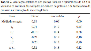 Para tais resultados, a média obtida pelas réplicas nas condições do ponto central foi de 0,98 com desvio padrão de 0,15 em termos de % de MHb (erro experimental de cerca de 15 %), podendo-se afirmar que as variáveis testadas não apresentam influência sobre o percentual de metemoglobina, pois todos os níveis testados de diferentes volumes apresentam resultados similares considerando o erro experimental em torno de 15% e um intervalo de confiança de 95%. Os resultados indicam que não há diferença estatisticamente significativa entre os volumes de reagentes testados, uma vez que todos os efeitos apresentam p > 0,05 (Tabela 2), ou seja, os resultados para os volumes de KCN e de K3Fe(CN)6 variando de 5 a 25 µL são similares, indicando que o percentual de metemoglobina formada é similar em toda esta faixa de reação. Assim, a análise estatística dos efeitos da variação de cianeto de potássio e de ferricianeto de potássio sobre o percentual de metemoglobina não mostrou efeito estatisticamente significativo da variação da metemoglobina em relação aos volumes das soluções de análise.