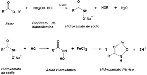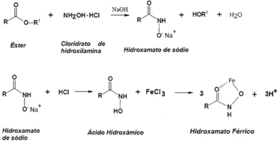 Figura 1. Reações químicas envolvidas no teste do ácido hidroxâmico (TAH) para confirmação da presença de ésteres (adaptado da Ref. 19)