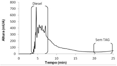 Os resultados da Tabela 2 mostram que das doze amostras comerciais analisadas pelo método EN 14078/2009, apenas as amostras 1 e 2 apresentam percentual de biodiesel fora da especificação prevista pela Resolução ANP nº 14/2012 (5 ± 0,5 % v/v). Apesar de ter sido analisado um número relativamente pequeno de amostras (doze amostras), este resultado sugere que a maioria dos postos de distribuição tem seguido a determinação da ANP quanto ao percentual de biodiesel no diesel. Segundo os dados do boletim mensal do monitoramento dos combustíveis líquidos automotivos da ANP, dentre as amostras coletadas no mês de março de 2014, 35,2% estão fora da especificação do percentual de biodiesel em óleo diesel.1 Análise das amostras por cromatografia líquida de alta eficiência As doze amostras comerciais foram analisadas por CLAE, de modo a verificar a presença de possíveis adulterações da mistura biodiesel:diesel por óleo vegetal. As amostras comerciais apresentaram o perfil cromatográfico mostrado na Figura 3, a partir do qual é possível concluir que as amostras comerciais não estão adulteradas com óleo vegetal, uma vez que não apresentaram picos na região entre 20 e 25 min, que são característicos dos triacilgliceróis - TAG (principal constituinte do óleo vegetal).22,23 Os picos largos na região entre 3 e 10 min são característicos da presença de diesel na amostra.