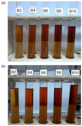 ![]() Figura 4. Resultado do teste colorimétrico do ácido hidroxâmico realizado nas amostras B2, B4, B6, B8 e B10 preparadas com o diesel S50 - amarelo (a) e com o diesel S500 - vermelho (b)