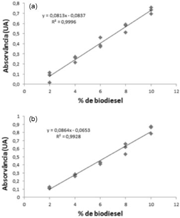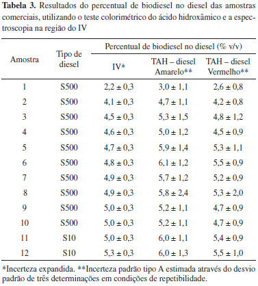 Foi observada uma relação linear entre o percentual de biodiesel e a absorvância, e os coeficientes de determinação (R2) indicaram uma forte correlação entre as duas variáveis. Após obtenção das curvas analíticas, as doze amostras comerciais foram analisadas, em triplicata, pelo teste colorimétrico do ácido hidroxâmico, para a quantificação do percentual de biodiesel nas amostras. Os valores da média das absorvâncias foram aplicados nas equações das retas encontradas, obtendo-se, então, o percentual de biodiesel. Os resultados obtidos pelo teste colorimétrico do ácido hidroxâmico e pela espectroscopia na região do IV estão na Tabela 3.
