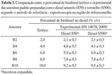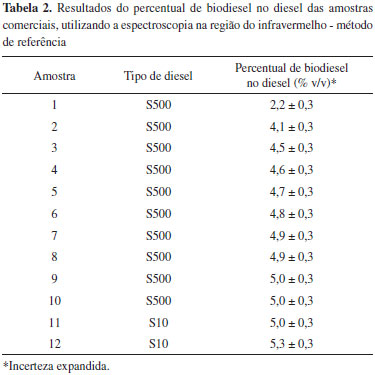 Os resultados da Tabela 1 mostram a similaridade dos valores percentuais de biodiesel no diesel, mostrando assim a eficiência do método de referência (EN 14078, 2009) na determinação do percentual de biodiesel em misturas com o diesel. Nas amostras com concentrações de biodiesel acima de 6% (v/v) foi realizada uma diluição prévia com querosene de modo a inseri-las na faixa de linearidade da curva de calibração obtida com diesel. A Tabela 2 apresenta os resultados dos percentuais de biodiesel no diesel, segundo o método de referência, EN 14078 (2009), das doze amostras comerciais estudadas neste trabalho.