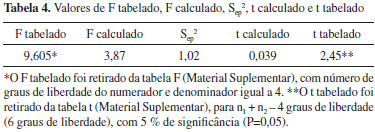 Como o valor de F calculado é menor do que o valor de F tabelado (Tabela 4), pode-se afirmar que a hipótese foi aceita e as variâncias das duas equações são, significativamente, semelhantes. Sendo assim, calculou-se a variância agrupada (Sep2), e, consequentemente, o valor de t, comparando-se com o valor tabelado de t (Tabela 2 - Tabela de testes t, material suplementar). Os resultados encontram-se na Tabela 4. Como o valor de t calculado é menor que o valor de t tabelado (Tabela 4), pode-se afirmar que as inclinações das retas são iguais, logo o tipo de diesel (S50, amarelo ou S500, vermelho) não influencia nos resultados do teste colorimétrico do ácido hidroxâmico. Aplicação do teste t de Student para comparação entre métodos Para verificar se os resultados fornecidos pelo teste colorimétrico do ácido hidroxâmico são equivalentes aos obtidos pelo método tradicional, previsto na ANP (EN 14078/2009), aplicou-se o teste t nas doze amostras comerciais. Os resultados de t calculado para o diesel S50 e S500 são, respectivamente, 0,00022 e 0,026. O valor de t tabelado (2,205) foi obtido por interpolação da tabela t (Tabela 2 - Tabela de testes t, material suplementar), para n-1 graus de liberdade (11 graus de liberdade), com 5% de significância (P=0,05). Como o valor de t calculado (diesel S50 e S500) é menor que o valor de t tabelado, pode-se afirmar com 95% de confiança que os métodos (teste colorimétrico do ácido hidroxâmico e a espectroscopia na região do IV) podem ser considerados equivalentes. A partir da aplicação da ANOVA com um fator (one-way ANOVA) também chega-se à mesma conclusão. Ou seja, como o valor de F calculado (2,526) é menor que o valor de F tabelado (3,285), podemos afirmar que não existem evidências estatísticas de que os resultados fornecidos pelos métodos (teste colorimétrico do ácido hidroxâmico e a espectroscopia na região do IV) sejam diferentes.