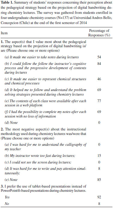 RESULTS AND DISCUSSION Digital handwriting projection using a tablet device was provided as instructional model in four introductory chemistry courses. The contents of each lecture were built instantly on the tablet screen, using digital ink to create freehand representations of the conceptual aspects, structures, equations and problems corresponding to each session. Handwritten notes were drawn in multiple colors, saved with acceptable quality in PDF files, and shared with students after each class. A key factor in this implementation is that learners can follow the instructor's cognitive process and the progressive development of contents during lectures by reproducing instantly the teacher's drawings and annotations. On the other hand, the tablet enables an instructor to immediately adapt the class contents in response to students' enquiries, and to easily highlight items directly on the screen while retaining facial contact with the audience, which is relevant to engage students and promote motivation during lectures. In addition, the use of a tablet to provide instruction avoids the loss of continuity and information that often occurs when instructors switch between pre-organized electronic slides and white/chalk board during lessons. Instead of that, the use of tablet-based presentations allow students to follow and register the content development during classes, which is guided by the teacher and enriched by students' questions throughout each session. Moreover, if something relevant has been missed by students, they can look up for this information in the corresponding session files and complete their notes after classes. With these qualitative features in mind, we have collected evidence from the intervened courses in order to assess the impact of the implemented pedagogical strategy on the students' perception and academic outcomes, as described in the following sections. Students' perception about the instructional method Students' perception about the pedagogical strategy based on the projection of digital handwriting during chemistry lectures was gathered from a web-based perception survey applied at the end of the semester to all students enrolled in the intervened courses (N=137), as summarized in Table 1. According to these results, students show a very positive opinion about the instructional method and acknowledge that the projection of digital handwriting allows them to follow the contents progress during lectures as its most valuable aspect. In addition, students acknowledge that taking notes and understanding problem solving strategies during lectures were facilitated by the projection of digitally handwritten annotations. In addition, almost all students opine that this pedagogical strategy is more preferable than the use of traditional electronic slides during chemistry lectures. These results suggest a positive impact on students' motivation and provide evidence about the favorable pedagogical impact of changing the instructional method from a traditional setting to a more active and process-focused strategy.