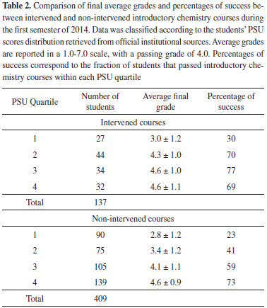 Students' academic outcomes As a means to measure the efficacy of the instructional method on the students' academic outcomes, a comparison of final average grades and percentages of success between students enrolled in intervened and non-intervened introductory chemistry courses is reported in Table 2. Students were classified according to their PSU scores, considering that the results of this standardized national university selection test have been widely employed as descriptors for the academic profile of first-year undergraduates in Chilean21 PSU data distribution suggests that students enrolled in intervened and non-intervened courses are comparable student populations with similar academic profiles. In addition, final average grades and percentages of academic success indicate that students enrolled in the intervened courses significantly over-performed compared to non-intervened students, which provides evidence about the benefits of the instructional methodology based on the innovative use of a tablet device to enable the real-time projection of digital handwriting in undergraduate introductory chemistry lectures. As pointed out by O'Malley "As many technological tools become available sound pedagogical reasons for adapting such approaches must be present rather than adopting new technology simply for its own sake".12 In this sense, the results of the present report support the inclusion of tablets as pedagogical tools in our educational context, where the access and insertion of technology in teaching activities is still incipient.