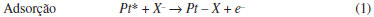 Centro de Ciências Naturais e Humanas, Universidade Federal do ABC, Av. dos Estados, 5001, 09210-580 Santo André - SP, Brasil Recebido em 04/11/2014 *e-mail: camilo.angelucci@ufabc.edu.br This review examined the state of the art of electrochemical and thermodynamic studies involving characteristic features related to the adsorption of anions present in the electrolyte solutions in contact with platinum single crystals electrodes. INTRODUÇÃO Desde a publicação em 1980, por Clavilier,1,2 de um novo método de obtenção e manejo de eletrodos monocristalinos de platina, conhecido como tratamento térmico por chama, foi possível estudar de modo reprodutível o comportamento intrínseco de vários processos adsortivos nessas superfícies e observou-se que, inicialmente, muitas interpretações controversas haviam sido propostas em relação aos processos superficiais presentes nos voltamogramas cíclicos dos eletrodos de Pt(hkl). O emprego dessa nova técnica revelou perfis voltamétricos correspondentes aos planos de base de Pt notavelmente diferentes dos obtidos com as técnicas empregadas até então. Os aspectos mais surpreendentes foram obtidos nos voltamogramas correspondentes às superfícies Pt(111) e Pt(100), pela existência de estados de adsorção em uma região de potenciais relativamente altos, nunca observados na voltametria de platina policristalina. A novidade desses estados foi classificada por Clavilier de estados não-usuais ou anômalos.2,3 Em outras palavras, uma pergunta feita quando se começa a estudar os voltamogramas cíclicos de eletrodos monocristalinos de platina é: qual é o processo superficial responsável pelo perfil voltamétrico dos estados de adsorção não-usuais? A estes estados não-usuais foram inicialmente atribuidos, em Pt(111), o processo de adsorção/dessorção de 1/3 de uma monocamada de hidrogênio UPD (do inglês: Under Potential Deposition ), sujeito à adsorção específica do ânion presente.3 No entanto, a hipótese de hidrogênio fortemente adsorvido foi atacada com o argumento que a extraordinária energia de adsorção (ΔH~160 kJ mol-1, em Pt(111) em ácido perclórico) exigiria um valor muito acima aquele obtido em experimentos de ultra alto vácuo (46 kJ mol-1) para se explicar a contribuição voltamétrica.4-6 Em 1983, Wagner e Ross7 conseguiram, por primeira vez, obter um voltamograma satisfatório (tal como o entendemos atualmente) correspondente à superfície de Pt(111) preparada em ultra alto vácuo. Vale destacar que esses autores preferiram explicar os estados não-usuais como referentes a um processo redox sofrido por alguma contaminação adsorvida, ainda que não descartassem a possibilidade de adsorção de íons hidroxila (OH-). De fato, utilizando eletrodos preparados por técnicas de ultra alto vácuo e subsequente caracterização mediante LEED (Difração de Elétrons de Baixa Energia) e AES (Espectroscopia Eletrônica Auger) foi possível obter voltamogramas similares ao dos monocristais descontaminados termicamente.8 Estes resultados demonstraram que o tratamento térmico produz superfícies ordenadas e limpas e que o perfil voltamétrico observado é intrínseco a estas superfícies. A partir daí foi possível descartar os efeitos estruturais e as impurezas como causas da aparição dos estados não-usuais, o que deixou como alternativa para explicar esses processos não-usuais a adsorção de oxigênio (ou espécies oxigenadas), hidrogênio e finalmente os ânions presentes no meio eletrolítico.7,9 Al Jaaf-Golze e colaboradores9 atribuíram aos estados de adsorção não-usuais, e às referidas correntes voltamétricas, somente a adsorção de ânions (sulfato ou bissulfato) devido à não dependência do potencial com o pH em solução de ácido sulfúrico para Pt(111). A questão central nesta interpretação, baseada no processo simples que é a adsorção de ânions, está claramente em correlacionar os altos valores de densidade de carga e o reduzido intervalo de potencial que aparecem os estados não-usuais de adsorção. Geralmente a adsorção de uma espécie carregada ocorre em um largo intervalo de potencial devido a interações repulsivas entre as espécies adsorvidas. Assim, a única maneira de levar em conta o comportamento observado para os estados não-usuais seria aceitar a adsorção do ânion e consequente transferência de carga.9-11 ![]() ![]() Onde a espécie carregada X- representa um ânion qualquer presente nas adjacências do sítio livre de platina (Pt*). É claro que a representação de X aqui é dependente da composição do eletrólito empregado, como, por exemplo, HSO4-, OH-, Cl-, entre outros. De um modo geral, a natureza e a concentração do eletrólito suporte tem um papel fundamental no perfil voltamétrico nos eletrodos monocristalinos, bem como na região de adsorção de hidrogênio, indicando a presença de competição das espécies pelos processos globais de adsorção sobre a superfície de platina.12 Os experimentos voltamétricos sozinhos não conseguem explicar e comprovar a presença das várias espécies envolvidas. Dessa maneira, muitas técnicas têm sido empregadas a fim de obter informações dos fenômenos responsáveis pelos estados não-usuais. Tem-se realizado medidas com marcadores radioativos,13,14 espectroscopia de infravermelho in situ (FTIRRAS),15-17 estudos com microscopia de tunelamento (STM)18-20 e deslocamento de carga com CO.21-23 Muitas técnicas geraram interpretações contraditórias, porém, o conjunto dos resultados permite compreender, ainda que não totalmente, os fenômenos que ocorrem na interface metal/solução quando um eletrodo de platina é colocado em contato com eletrólitos de diferentes composições. Independentemente dos aspectos fundamentais, a adsorção de ânions afeta a reatividade de processos com importância prática, como eletrossíntese e deposição de metais, e são efetivos na inibição/promoção d