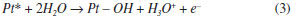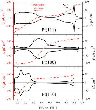 ![]() Figura 4. Densidade de carga total (eixo da esquerda) para Pt(hkl) em 0,1 mol L-1 HClO4 obtidos através da integração da varredura positiva dos voltamogramas (eixo da direita). Os valores de potencial que as curvas cruzam o eixo de q=0 são considerados como o potencial de carga total zero (pctz)