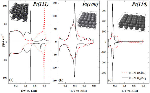 REFERÊNCIAS E NOTAS 1. Clavilier, J.; Faure, R.; Guinet, G.; Durand, R.; J. Electroanal. Chem. 1980, 360, 325. DOI: http://dx.doi.org/10.1016/0022-0728(93)87025-Q 2. Clavilier, J.; J. Electroanal. Chem. 1980, 107, 211. DOI: http://dx.doi.org/10.1016/S0022-0728(79)80023-6 3. Clavilier, J.; Durand, R.; Guinet, G.; Faure, R.; J. Electroanal. Chem. 1981, 127, 281. DOI: http://dx.doi.org/10.1016/S0022-0728(81)80488-3 4. Jerkiewicz, G.; Electrocatalysis 2010, 1, 179. DOI: http://dx.doi.org/10.1007/s12678-010-0016-z 5. Christmann, K.; Ertl, G.; Pignet, T.; Surf. Sci. 1976, 54, 365. DOI: http://dx.doi.org/10.1016/0039-6028(76)90232-6 6. Markovic, N. M.; Schmidt, T. J.; Grgur, B. N.; Gasteiger, H. A.; Behm, R. J.; Ross, P. N.; J. Phys. Chem. B 1999, 103, 8568. DOI: http://dx.doi.org/10.1021/jp991826u 7. Wagner, F. T.; Ross Jr., P. N.; J. Electroanal. Chem. Interfacial Electrochem. 1988, 250, 301. DOI: http://dx.doi.org/10.1016/0022-0728(88)85172-6 8. Aberdam, D.; Durand, R.; Faure, R.; El-Omar, F.; Surf. Sci. 1986, 171, 303. DOI: http://dx.doi.org/10.1016/0167-2584(86)91147-3 9. Jaaf-Golze, K. A.; Kolb, D. M.; Scherson, D.; J. Electroanal. Chem. 1986, 200, 353. DOI: http://dx.doi.org/10.1016/0022-0728(86)90067-7 10. Scherson, D. A.; Kolb, D. M.; Electroanal. Chem. Interf. Electrochem. 1984, 176, 353. DOI: http://dx.doi.org/10.1016/S0022-0728(84)80330-7 11. Adzic, R. R.; Feddrix, F.; Nikolic, B. Z.; Yeager, E.; J. Electroanal. Chem. 1992, 341, 287. DOI: http://dx.doi.org/10.1016/0022-0728(92)80489-Q<, /p> 12. Garcia-Araez, N.; Lukkien, J. J.; Koper, M. T. M.; Feliu, J. M.; J. Electroanal. Chem. 2006, 588, 1. DOI: http://dx.doi.org/10.1016/j.jelechem.2005.11.034 13. Gamboa-Aldeco, M. E.; Herrero, E.; Zelenay, P. S.; Wieckowski, A.; J. Electroanal. Chem. 1993, 348, 451. DOI: http://dx.doi.org/10.1016/0022-0728(93)80151-7 14. Kolics, A.; Wieckowski, A.; J. Phys. Chem. B 2001, 105, 2588. DOI: http://dx.doi.org/10.1021/jp003536f 15. Iwasita, T.; Nart, F. C.; Rodes, A.; Pastor, E.; Weber, M.; Electrochim. Acta 1995, 40, 53. DOI: http://dx.doi.org/10.1016/0013-4686(94)00239-W 16. Nart, F. C.; Iwasita, T.; Weber, M.; Electrochim. Acta 1994, 39, 961. DOI: http://dx.doi.org/10.1016/0013-4686(94)85113-1 17. Shingaya, Y.; Ito, M.; Chem. Phys. Lett. 2001, 340, 425. DOI: http://dx.doi.org/10.1016/S0009-2614(01)00374-8 18. Braunschweig, B.; Daum, W.; Langmuir 2009, 25, 11112. DOI: http://dx.doi.org/10.1021/la901399j PMID: 19456179 19. Friebel, D.; Broekmann, P.; Wandelt, K.; physica status solidi (a) 2004, 201, 861. DOI: http://dx.doi.org/10.1002/pssa.200304371 20. Itaya, K.; Prog. Surf. Sci. 1998, 58, 121. DOI: http://dx.doi.org/10.1016/S0079-6816(98)00022-7 21. Souza-Garcia, J.; Climent, V.; Feliu, J. M.; Electrochem. Commun. 2009, 11, 1515. DOI: http://dx.doi.org/10.1016/j.elecom.2009.05.044 22. Chen, Q.-S.; Solla-Gullon, J.; Sun, S.-G.; Feliu, J. M.; Electrochim. Acta 2010, 55, 7982. DOI: http://dx.doi.org/10.1016/j.electacta.2010.03.050 23. Orts, J. M.; Gómez, R.; Feliu, J. M.; Aldaz, A.; Clavilier, J.; Electrochim. Acta 1994, 39, 1519. DOI: http://dx.doi.org/10.1016/0013-4686(94)85129-8 24. Abruña, H. D.; Feliu, J. M.; Brock, J. D.; Buller, L. J.; Herrero, E.; Li, J.; Gómez, R.; Finnefrock, A.; Electrochim. Acta 1998, 43, 2899. DOI: http://dx.doi.org/10.1016/S0013-4686(98)00030-9 25. Kuzume, A.; Herrero, E.; Feliu, J. M.; J. Electroanal. Chem. 2007, 599, 333. DOI: http://dx.doi.org/10.1016/j.jelechem.2006.05.006 26. Souza-Garcia, J.; Ticianelli, E. A.; Climent, V.; Feliu, J. M.; Electrochim. Acta 2009, 54, 2094. DOI: http://dx.doi.org/10.1016/j.electacta.2008.08.059 27. Tanaka, A.; Adzic, R.; Nikolic, B.; J. Serb. Chem. Soc. 1999, 64, 695. 28. Angelucci, C. A.; Nart, F. C.; Herrero, E.; Feliu, J. M.; Electrochem. Commun. 2007, 9, 1113. DOI: http://dx.doi.org/10.1016/j.elecom.2007.01.012 29. Rodríguez-López, M.; Solla-Gullón, J.; Herrero, E.; Tuñón, P.; Feliu, J. M.; Aldaz, A.; Carrasquillo Jr, A.; J. Am. Chem. Soc. 2010, 132, 2233. DOI: http://dx.doi.org/10.1021/ja909082s PMID: 20121124 30. Santos, V. P.; Tremiliosi Filho, G.; Quim. Nova 2001, 24, 856. DOI: http://dx.doi.org/10.1590/S0100-40422001000600024 31. http://surfexp.fhi-berlin.mpg.de/SXinput.html, acessada em Dezembro 2014 32. Strauss, S. H.; Chem. Rev. 1993, 93, 927. DOI: http://dx.doi.org/10.1021/cr00019a005 33. Calvente, J. J.; Marinkovic, N. S.; Kovacova, Z.; Fawcett, W. R.; J. Electroanal. Chem. 1997, 421, 49. DOI: http://dx.doi.org/10.1016/S0022-0728(96)04857-7 34. Markovic, N.; Hanson, M.; McDougall, G.; Yeager, E.; J. Electroanal. Chem. 1986, 214, 555. DOI: http://dx.doi.org/10.1016/0022-0728(86)80124-3 35. Yau, S. L.; Itaya, K.; Colloids Surf., A 1998, 134, 21. DOI: http://dx.doi.org/10.1016/S0927-7757(97)00309-9 36. Berná, A.; Feliu, J. M.; Gancs, L.; Mukerjee, S.; Electrochem. Commun. 2008, 10, 1695. DOI: http://dx.doi.org/10.1016/j.elecom.2008.08.042 37. O termo (bi)sulfato aqui utilizado refere-se aos ânions bissulfato (HSO4-) e sulfato (SO42-) que podem estar presentes na superfície do eletrodo. Maiores detalhes sobre essa diferenciaçao serao apresentados nos parágrafos seguintes. 38. Howard, S. T.; Attard, G. A.; Lieberman, H. F.; Chem. Phys. Lett. 1995, 238, 180. DOI: http://dx.doi.org/10.1016/0009-2614(95)00335-5 39. Olivera, P. P.; Parito, E. M.; Sellers, H. In Interfacial electrochemistry: theory, experiment, and applications; Wieckowski, A., ed.; Marcel-Dekker: New York, 1999, p 63. 40. Clavilier, J.; Albalat, R.; Gomez, R.; Orts, J. M.; Feliu, J. M.; Aldaz, A.; J. Electroanal. Chem. 1992, 330, 489. DOI: http://dx.doi.org/10.1016/0022-0728(92)80326-Y 41. Climent, V.; Gómez, R.; Feliu, J. M.; Electrochim. Acta 1999, 45, 629. DOI: http://dx.doi.org/10.1016/S0013-4686(99)00241-8 42. Climent, V.; Gómez, E.; Orts, J. M.; Feliu, J. M. In Hydrogen at surface and interfaces; Jerkiewicz, G.; Feliu, J. M.; Popov, B. N., eds.; The Electrochemical Society: Pennington, NJ, 2000; Vol. 2000-16. 43. Sibert, E.; Faure, R.; Duran