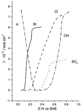 ![]() Figura 2. Excesso superficial de cloreto, brometo e (bi)sulfato em Pt(111) em 0,1 mol L-1 HClO4 calculado por análise termodinâmica. Esta Figura foi extraída da Ref. 52 com permissão de reprodução da Editora Elsevier