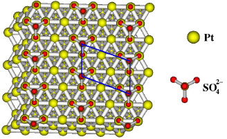 ![]() Figura 3. Modelo para representar a estrutura (√3x√7)R19.1º para adsorção de sulfato em uma superfície de geometria (111), como sugerido pelas Ref. 72, 73, 75